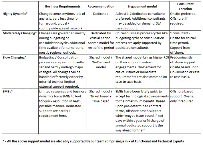 Each organisation follow an unwritten trend during their budgeting or consolidation cycle and based upon the same we have devised the below unique support reference table which might assist you to understand the right model to suit your requirements: